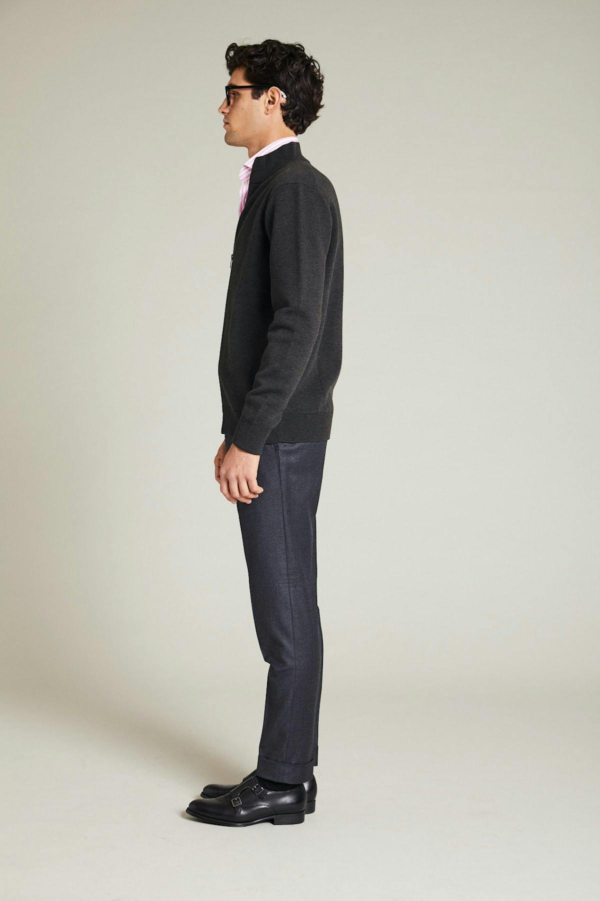 Taking cues from heritage knitwear, this wool Grey green blend zip knit is a great outerwear piece, perfect for layering and battling the cold with. Warm and comfortable, it features a full zip and an elasticated cuff, collar band and body hem for shape and added warmth. Designed and cut to be a regular fit for comfort and featured in two colours: bottle green and black, this zip knit is available in sizes medium and large. Model is 183cm tall, 94cm chest, 72cm waist and wears size small.