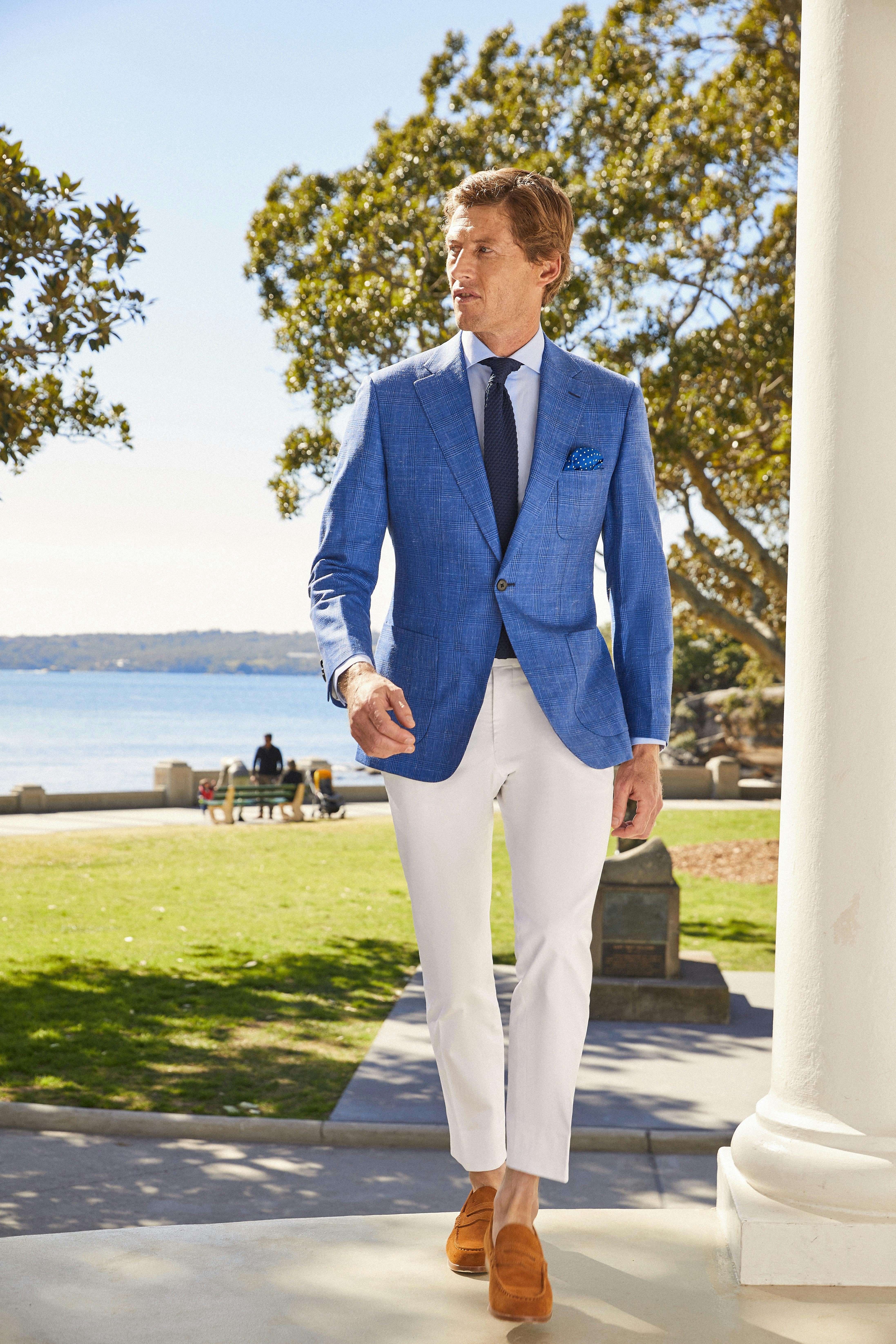 Versatile, practical and durable, these chino pants are crafted from an artful blend of cotton and spandex, ensuring there's just enough stretch for maximum wearability and use. In a distinct but classic white, these pants are featured here with details like side tabs and dark buttoning, but can be customised to your every taste and need. Pair with sneakers and a knit for a casual tailored look, with loafers and a blazer for an Amalfi riff on smart/casual, or go a step further and pair with a bow tie and linen/cotton white dinner jacket, for a relaxed spin on formal tailoring. This garment is made-to-measure and therefore covered by our Perfect FIt Guarantee.